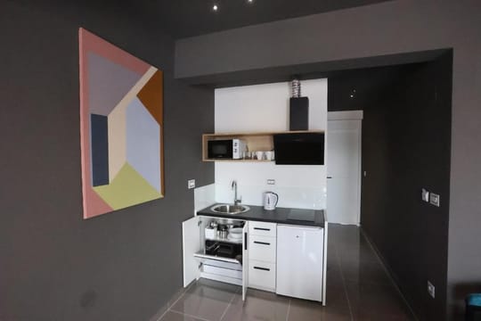 Uživajte u miru i udobnosti našeg deluxe apartmana. U dnevnoj sobi vas čeka moderna kada za opuštanje. Apartman je idealan za parove i posebne trenutke. Ima veliki krevet, kuhinju, besplatan Wi-Fi i parking.